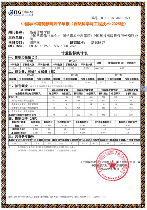 近日,中国学术期刊(光盘版)电子杂志社有限公司、中国科学文献计量评价研究中心发布《中国学术期刊影响因子年报(自然科学与工程技术·2025版)》。《热带作物学报》再次入选2025年《中国学术期刊影响因子年报》统计源期刊,本刊各项指标显著提升。
