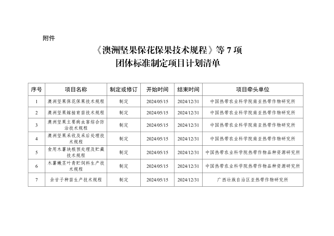 附件:《澳洲坚果保花保果技术规程》等7项团体标准制定项目计划清单